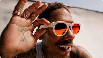 with speakers built right into the frames. - Listen to Spotify, Apple Music, and more with just a “Hey Meta” or a tap. Queue up