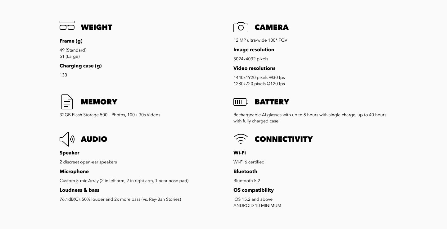 IMPORTANT! For ages 13 and up · May interfere with personal medical devices · Full voice commands available only in English, French, Spanish and Italian · Requires: a mobile phone with Android™ (location services enabled) or an iPhone™ with iOS™ operating system, wireless internet access, and a Meta™ account · Detailed system requirements, software terms of license, terms of service are available at www.oakley.com™· Warranty information inside and available at www.oakley.com™ · Features, functionality and content are subject to change or withdrawal at any time, may be protected by digital rights management technology, unavailable or restricted in some areas, may depend on wireless service plan or internet service provider and may require subscriptions or fees · Requires updates to be installed from time to time, including prior to first use · This device complies with part 15 of the FCC Rules. Operation is subject to the following two conditions: (1) This device may not cause harmful interference; and (2) this device must accept any interference received, including interference that may cause undesired operation. Data Storage Capacity 32 GB. Wall adapter and cable not included.