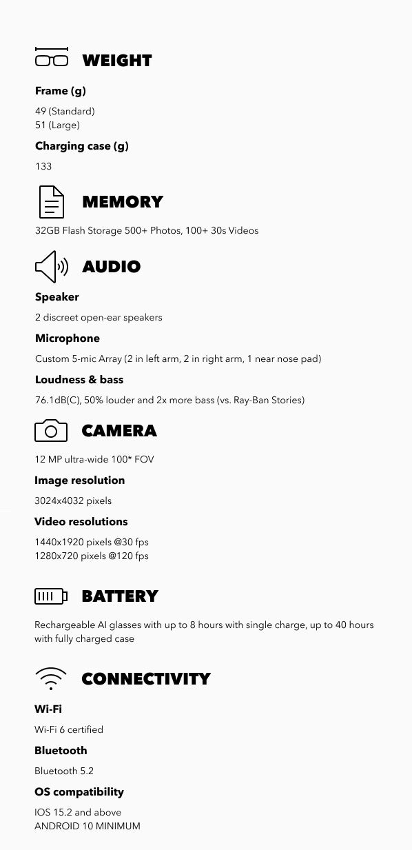 - Listen to music, podcasts, and more through Bluetooth speakers seamlessly integrated into the frames